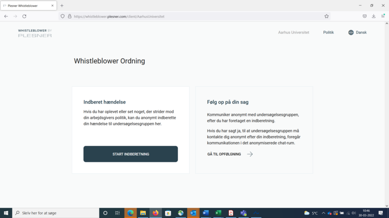 It is possible to report both anonymously, so that only the Plesner law firm is aware of the identity of the whistleblower, or with double anonymity, in which case neither Plesner nor the university are aware of the complainant's identity. Anonymity is also maintained for any access to documents. In the event of double anonymity, the whistleblower is, however, responsible for regularly logging onto the system to see if there are any follow-up questions or responses to the reporting in the system. If any questions are not answered, a report may be shelved.