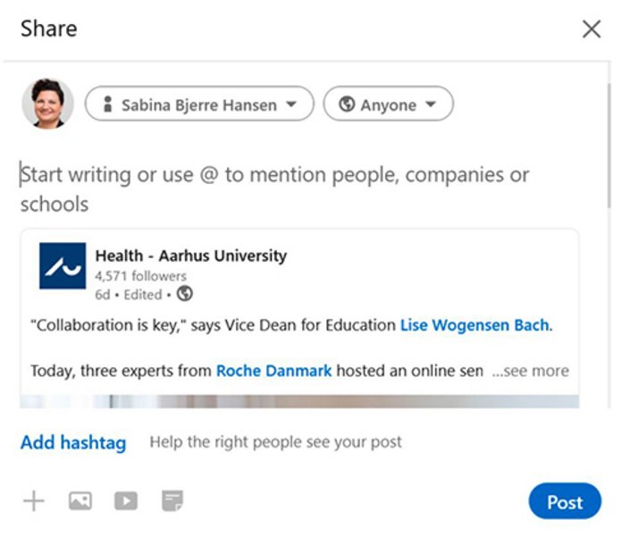 Når du bruger visuelle elementer, som fx et billede, i dine opslag, er der større chance for, at dit netværk vil reagere på dit indhold. Husk altid at lægge en tekst ud sammen med billedet, så du hjælper dit netværk til at forstå, hvorfor du deler lige netop det billede.