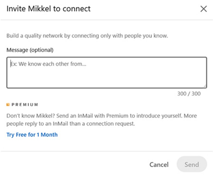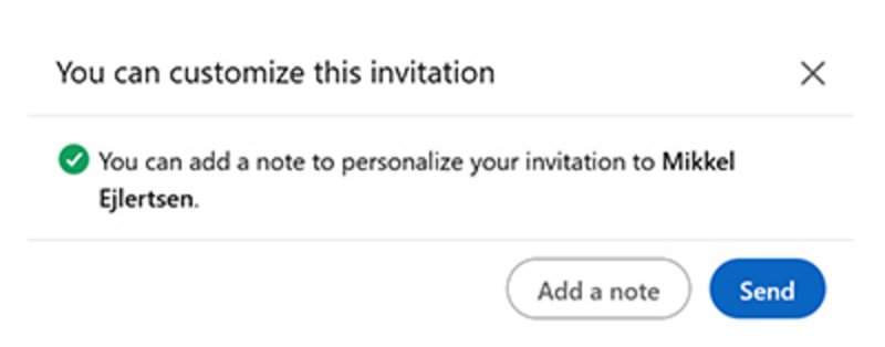 Når du inviterer folk (især dem, du ikke kender) til at connecte, er det god stil at tilføje en kort kommentar om, hvorfor du gerne vil connecte. Det gør du ved at klikke ’Add a note’, inden du trykker på ’Send’.