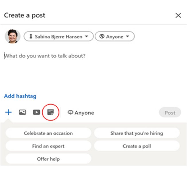 Du kan også dele PDF-, PowerPoint og Word-dokumenter i et post på LinkedIn. På den måde kan du fx dele slides fra en præsentation eller andet relevant indhold med dit netværk.